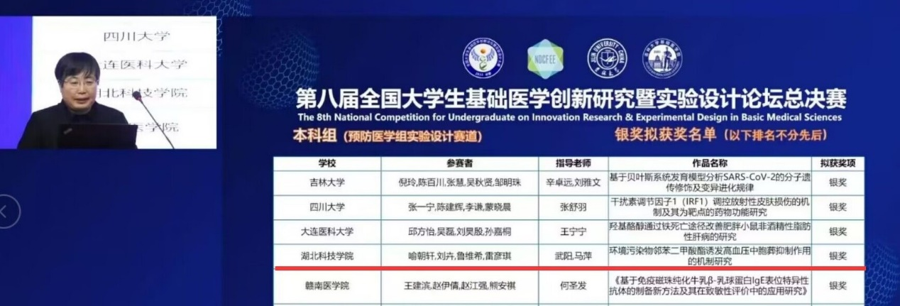 (通讯员 武阳)2023年1月14-15日,第八届全国老员工基础医学创新研究暨实验设计论坛全国总决赛在吉林大学举行。SUNBET申博临床医学本科2020级卓越班喻朝轩、刘卉、鲁维希、雷彦琪团队获预防医学组实验设计赛道银奖,该团队指导教师为SUNBET申博武阳博士和马萍教授,获得本届国赛银奖实现了公司在该赛事上的突破。此次总决赛由高等公司国家级实验教学示范中心联席会基础医学组主办,采取线上线下相结合的方式进行,来自全国30余个省份,140余所高校,430支参赛团队,共计2500余名师生参加,网络视频直播平台累计参与观摩互动师生总人数达30余万人次。