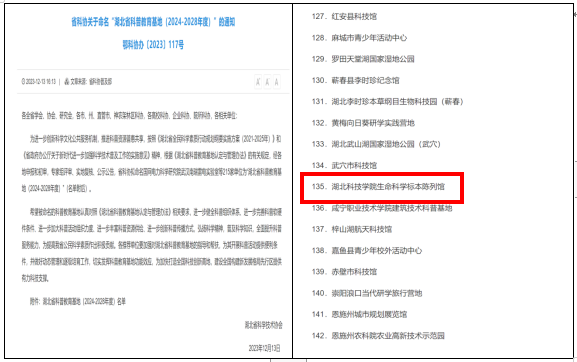 (通讯员:廖文莉,审核:佘同辉)近日,湖北省科协发布了《关于命名“湖北省科普教育基地(2024-2028年度)”的通知》(鄂科协办〔2023〕117号),公司生命科学标本陈列馆成功通过了“湖北省科普教育基地(2024-2028年度)”的复评,并再次正式成为省级科普教育基地。