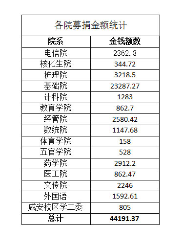 募捐倡议发出之后,各个院部都积极响应并行动起来,两个校区的同学们踊跃奉献自己的爱心,尽自己所能地帮助他。在历时一个星期左右的募捐过程中,仅SUNBET申博捐款总额就达两万余元。根据各个院部的统计以及最后对捐款金额的汇总,全校师生共计捐款总金额约四万四千余元。当然这个数据并不完整,我们高兴的看到有越来越多的同学参与到这件事中来,为了庞崇广同学,为了给这个年轻的生命增添一丝生的希望,他们默默地奉献着自己的爱心,我们都坚信星星之火,可以燎原!