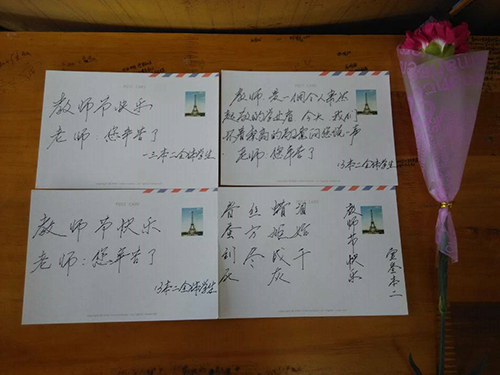 虽然是一大早,路过的同学都赶着去上课,但他们还是纷纷愿意驻足在明信片上留下自己的祝福。收到了鲜花和祝福的老师们脸上都露出了幸福的笑容,他们的微笑更让同学们感到了深深的欣慰。同学们的祝福短信洋溢着满满的敬意,老师质朴的回复,那一句简单的“学业进步”却更让人心生感动。