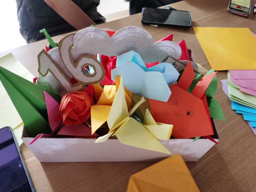 班委收集了全班的祝福语,莫子娟等同学将彩纸折叠成千纸鹤、玫瑰花、纸飞机等具有美好寓意的折纸作品,经过13位心灵手巧的同学的努力,大家完成了一盒承载着大家满满心意和祝福的花篮。