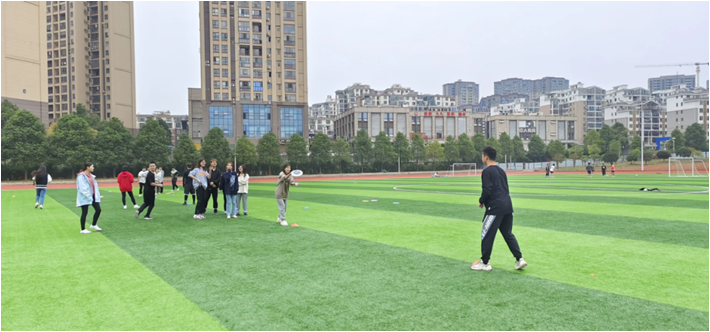 跑步热身后,教练们向学员们简单介绍飞盘运动的起源、发展、主要赛事及规则。在听完教练的讲解后,每两名学员为一组进行飞盘的传接训练。一开始学员们互传飞盘并不熟练,这导致分盘偏离轨迹,大家满操场去接飞盘,正是在这个过程中,大家互相磨合培养默契度。