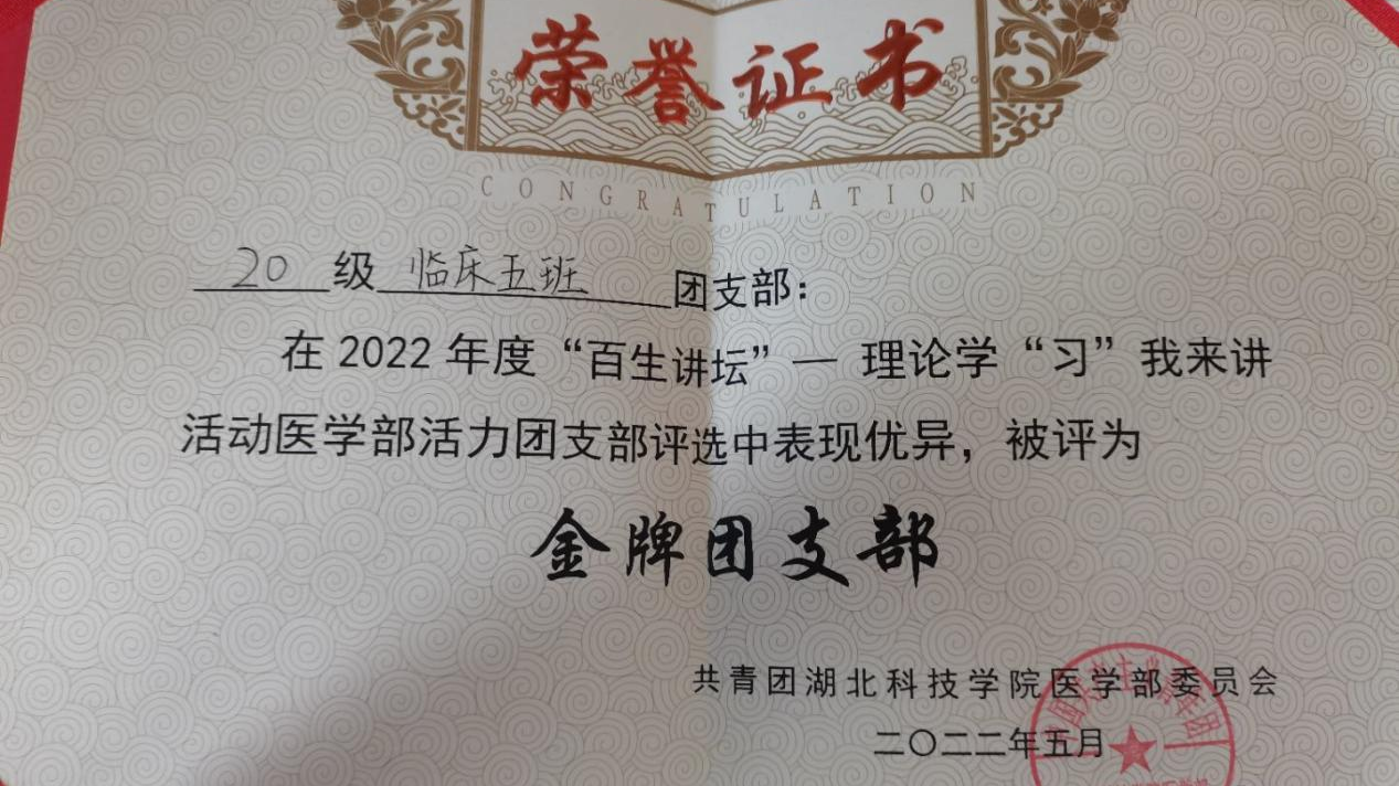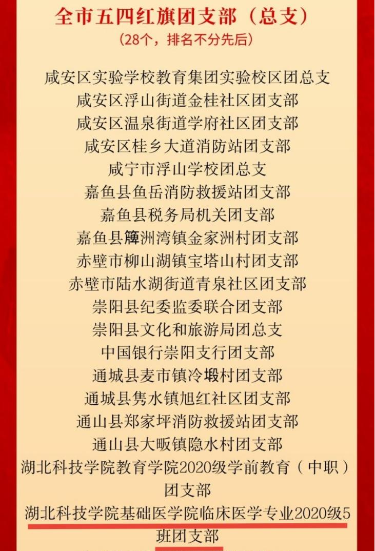青年强则国强,“五四”青年节到来之际,一批咸宁优秀青年个人或集体获得表彰,其中,SUNBET申博临床医学专业2020级5班团支部获评咸宁市“五四红旗团支部”,团支部成立于2020年9月,设有书记1名,副书记1名,组织委员1名,宣传委员1名,文体委员1名,现有团员50人。曾获2021年度和2022年度SUNBET申博“先进班集体”,2021年度SUNBET申博“五四红旗团支部”等荣誉称号。