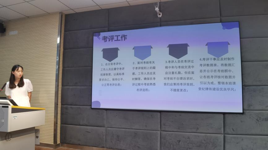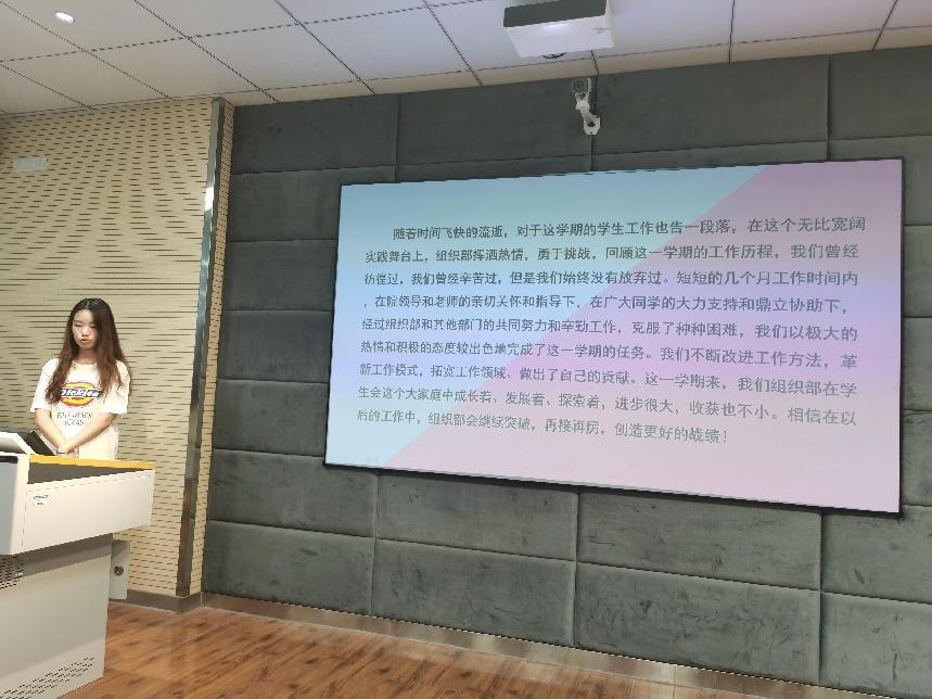 会议上,各部门负责人依次上台进行述职报告演讲,对其部门一学年的工作情况进行总结汇报。述职中,各部门负责人简明的概述了工作中的收获与不足,并提出了今后的整改措施和工作计划的方向以及对各自部门活动提出了一些创新性的建议,希望在今后的工作中各部门能够相互帮助,取长补短,共同进步将SUNBET申博团委员工会打造成一个更好的集体。同时,各部门负责人也简述了自己部门中成员的经历变化,从略知到可见的进步成长。