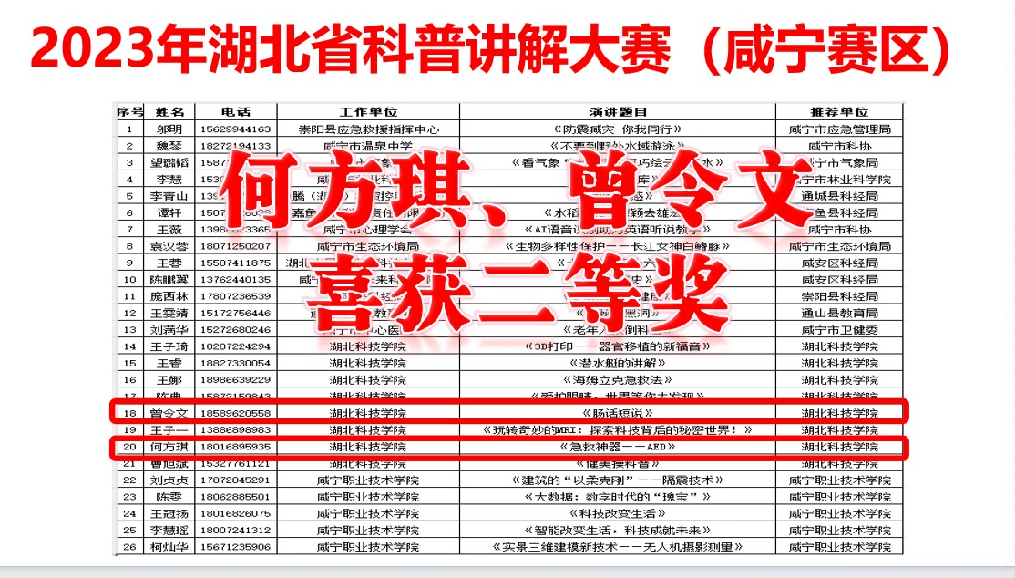 (通讯员:潘丹 廖文莉 ,审核:佘同辉)2023湖北省科普讲解大赛(咸宁赛区预赛)暨SUNBET申博第三届医学科普讲解大赛于10月9日在SUNBET申博举行。SUNBET申博生命科学标本陈列馆讲解员团队首次参赛并获得佳绩:2021级SUNBET申博员工何方琪、曾令文获得市赛二等奖和校赛三等奖,2022级五官医公司员工刘湘、徐夕喆获得优胜奖。