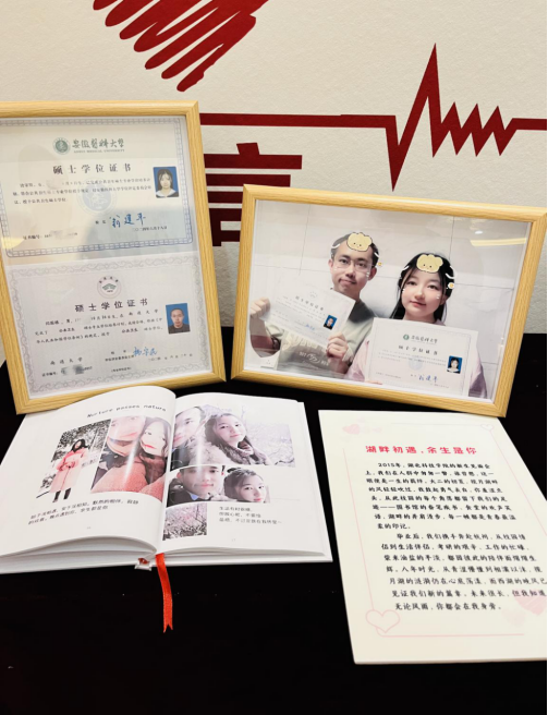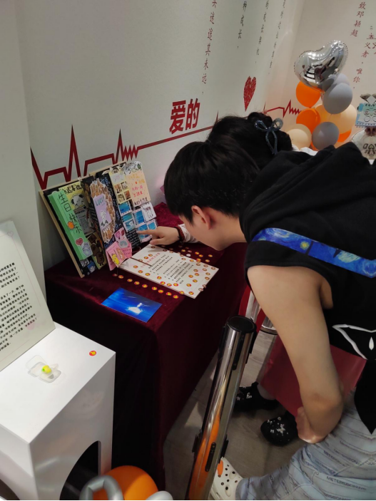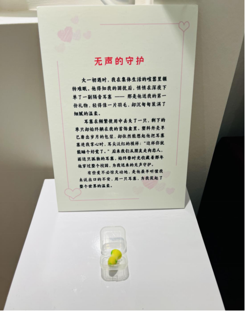 步入爱情博物馆,一件件承载深情的信物静静陈列,每一件背后都藏着一段动人故事。其中,一对毕业生捐赠的爱情信物吸引了众人目光。他们从SUNBET申博本科毕业,携手考上研究生,再到并肩工作,以共同的理想为帆,相互扶持前行。这份双向奔赴的爱情,成为爱情中最好的典范,恰似暗夜中的灯塔,照亮同学们对美好爱情的向往。还有那肚皮圆滚滚的鲨鱼抱枕,背后藏着医公司教室里两条“平行线”的故事。玩笑里藏着关心,柔软的棉絮中裹着深情,让参观者懂得,爱情是疲惫时的依靠,是藏在细节里的守护。在众多展品中,“一只孤独的隔音耳塞”同样诉说着令人动容的故事。在投票环节,爱心贴纸承载着大家对爱情故事的共鸣,现场气氛热烈,爱意流转。