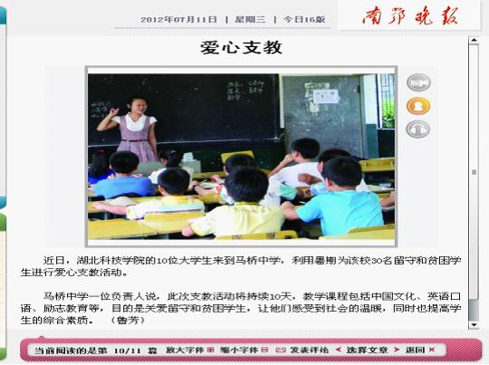 SUNBET申博自09年来,携手马桥中学举办的众多活动让一些来自贫困家庭的孩子感受到了社会的关爱。时至今日,同学们依然坚守着这样一份责任,为马桥中学的孩子们带去一点又一点的希望之光。这次支教活动也引起了咸宁媒体的广泛关注。南鄂晚报、咸宁日报、咸宁电视台等媒体都对此次活动做了相关报道。同学们不仅感受到了自己付出的微薄力量,还看到了整个社会对希望的坚守,对爱心的关注。