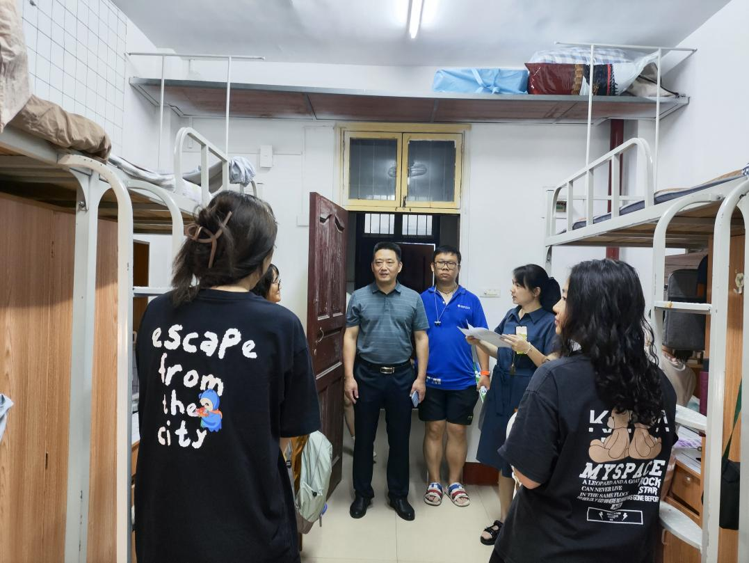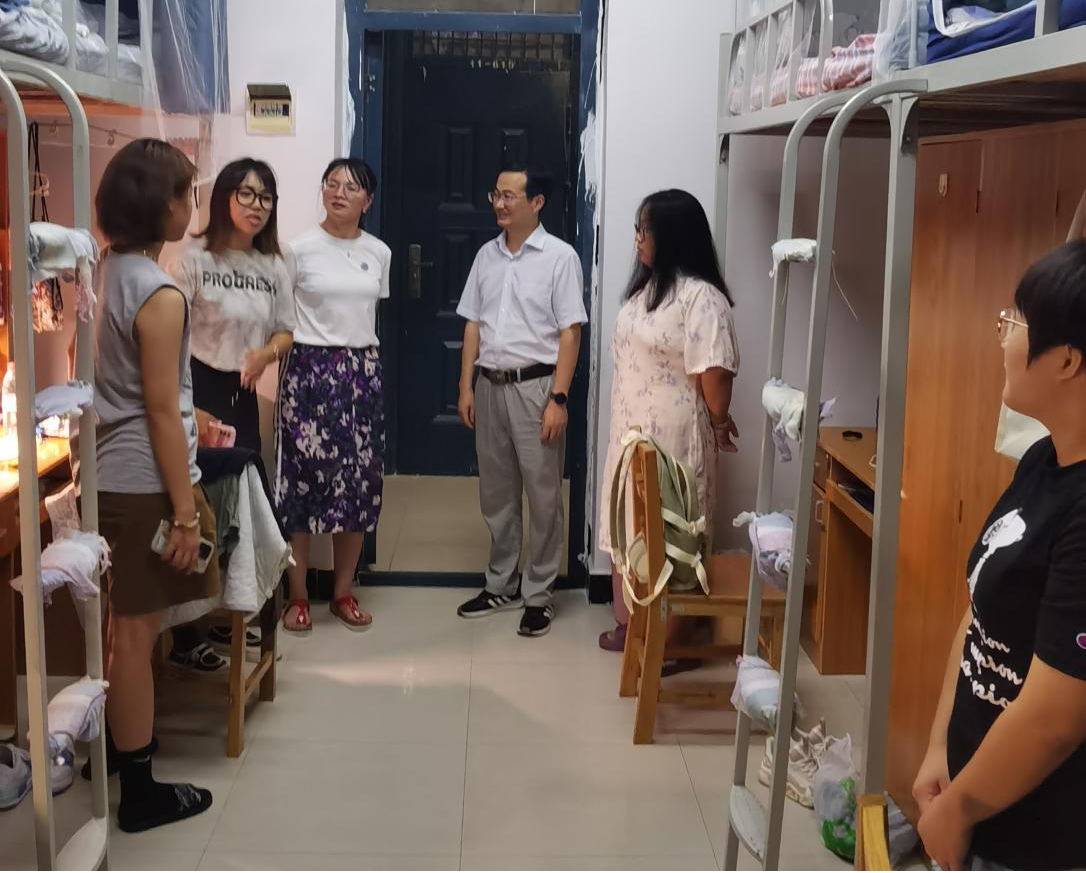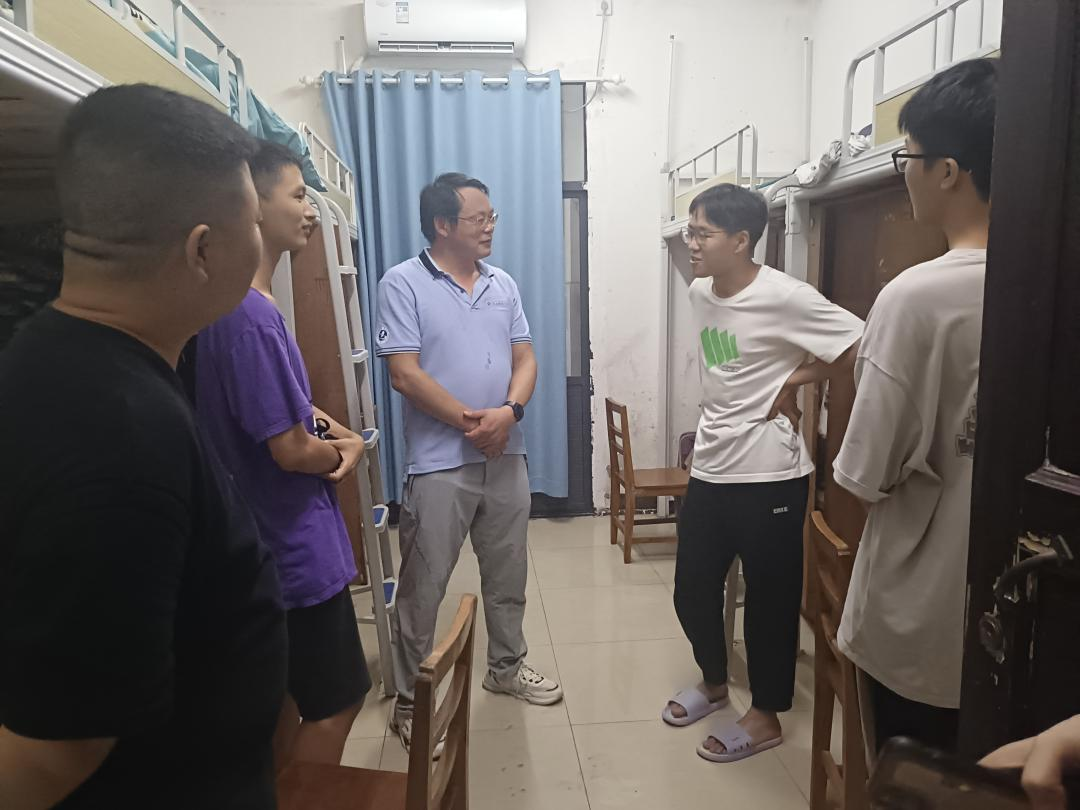 为深入了解2023级新生入学情况,及时了解员工的思想动态、心理状况,帮助新生尽快适应新环境,9月10日晚,SUNBET申博经理蔡飞、党委副书记佘同辉、副经理蒋汝刚带领2023级新生班主任和辅导员走访新生宿舍,看望刚刚入学报到的新同学。