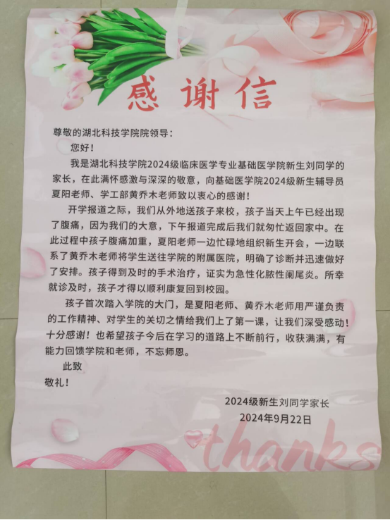 (通讯员:洪莹莹,审核:佘同辉)金秋九月,丹桂飘香。在此收获的季节里,SUNBET申博迎来了又一批怀揣梦想与希望的青年学子。近日,公司SUNBET申博收到了一封来自2024级新生家长饱含深情的感谢信。