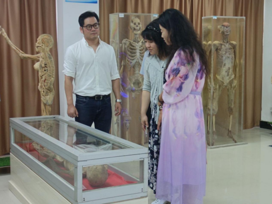 参观中,塑化标本展区成焦点,吴攀峰详细讲解塑化技术原理与优势并邀请众人触摸体验,一行人为标本是真实生物组织经先进技术处理而成倍感惊讶,既叹服技术前沿,也认可陈列馆技术创新成果;于洪钊教授一行还对牙齿切片标本及硬组织切割技术专利展品兴趣浓厚,驻足观察并与校方交流技术细节,了解该技术在口腔医学研究与临床教学中的应用,同时也认可馆内VR标本展示系统为医学教育现代化提供新路径。在古生物与人体标本展区,明朝末年员外夫人古尸标本引人关注,看到古尸遗存小脚、了解缠足对人体骨骼的影响后,于洪钊教授一行围绕古尸保存环境、保护技术提问,吴攀峰细致解答,加深了大家对文物标本保护工作的认识。