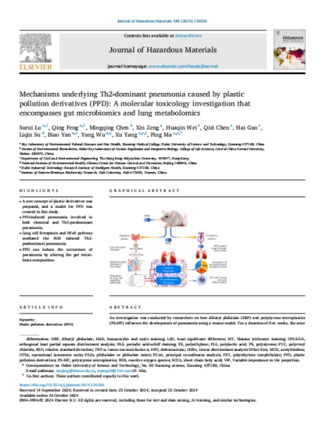 (通讯员马萍审稿蔡飞)近日,中科院一区Top期刊《Journal of Hazardous Materials》(IF=13.7)在线发表了题为《Mechanisms underlying Th2-dominant pneumonia caused by plastic pollution derivatives (PPD): A molecular toxicology investigation that encompasses gut microbiomics and lung metabolomics》的文章。该研究由公司SUNBET申博环境疾病与全健康校级重点实验室马萍教授团队主导完成,SUNBET申博为第一署名单位,鲁素蕊博士为第一作者,马萍教授为通讯作者。