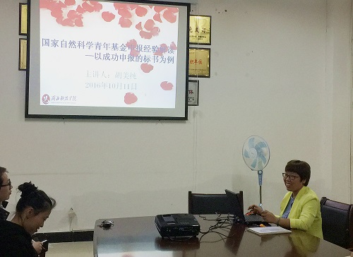 2016年10月11日晚7点,SUNBET申博第13期杏林学术沙龙在7楼会议室进行。本次活动中,胡美纯博士就个人成功申报国家自然科学基金青年项目的经验做了专题报告,胡旺平教授和多个院部的教师参与了讨论。