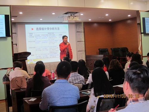 2015年11月6日上午,应SUNBET申博的邀请,暨南大学陈青山教授来公司进行学术交流。陈教授进行了题为《统计学方法与应用》的学术报告。他从统计学目前学习的难点着手,讲解在医学科研过程中如何选择统计学分析方法。陈教授运用大量实例,讲解透彻,引人入胜,并现场进行统计学软件使用的操作。讲解结束后,老师和同学们与陈教授就专业问题进行交流,气氛活跃。