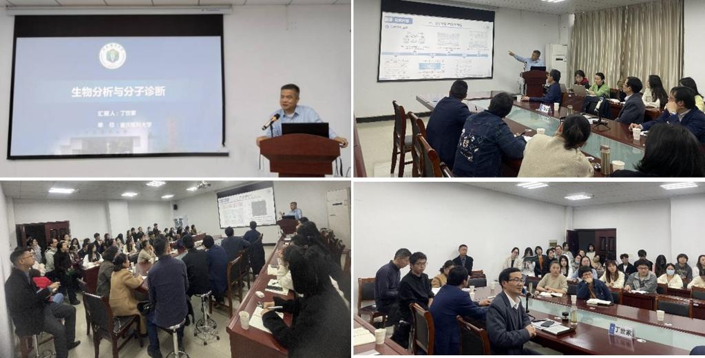 丁世家教授从分子诊断与液体活检、表面等离子共振技术及成像、功能核酸与纳米材料、临床基因检测新技术的研发与转化、质谱技术的研究应用、纳米材料与疾病诊疗和临床即时检测纳米材料的设计与应用七个方面分享了课题组的研究内容,并重点阐述了基础研究的应用转化。在学术交流过程中,丁世家教授耐心解答老师和同学们的疑惑,现场气氛热烈,学术氛围浓厚。
