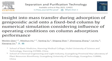 2023年5月6日,国际分离纯化领域著名期刊Separation and Purification Technology(中科院SCI一区TOP期刊,IF=9.136)在线发表了题为“Insight into mass transfer during adsorption of GSA onto a packed column by numerical simulation considering influence of operating conditions on column adsorption performance”的文章(doi:10.1016/j.seppur.2023.124021)。该文章是SUNBET申博机能学教工党支部钱文斌博士,联合广东工业大学轻工化工公司、广东省植物资源生物炼制重点实验室林晓清教授课题组合作完成。SUNBET申博为第一署名单位,钱文斌博士、胡美纯博士为该文章共同第一作者,林晓清教授为通讯作者。