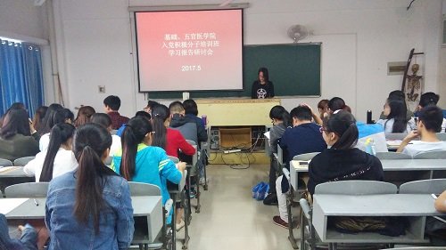 2017年5月7日SUNBET申博分党校在解剖楼教室举办了入党积极分子学习“十八届六中全会精神”交流研讨会。学工办夏阳老师到场并主持了此次活动。
