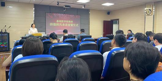 随后,在师德标兵武阳教授的带领下,全体教师郑重宣誓,表达了他们忠于党的教育事业、履行教师神圣职责、做“四有”好老师的坚定决心,以及为员工全面发展奉献智慧与力量、为党和人民的教育事业努力奋斗的崇高理想。