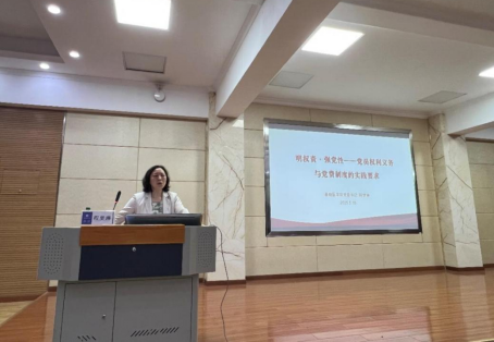 随后,程梦琳以《明权责•强党性—党员权利义务与党费制度的实践要求》为主题,系统详细地讲解了党员权利和义务两者的含义、两者的主要内容及辩证关系,如何从思想和行动上规范自我行为,自觉履行党员义务以及有关党费的交纳与使用等内容。她鼓励全体学员把学习和践行党章作为必修课,自觉做到内化于心、外化于行,始终做到爱党、信党、护党,永远同党保持一致,坚定不移跟党走。